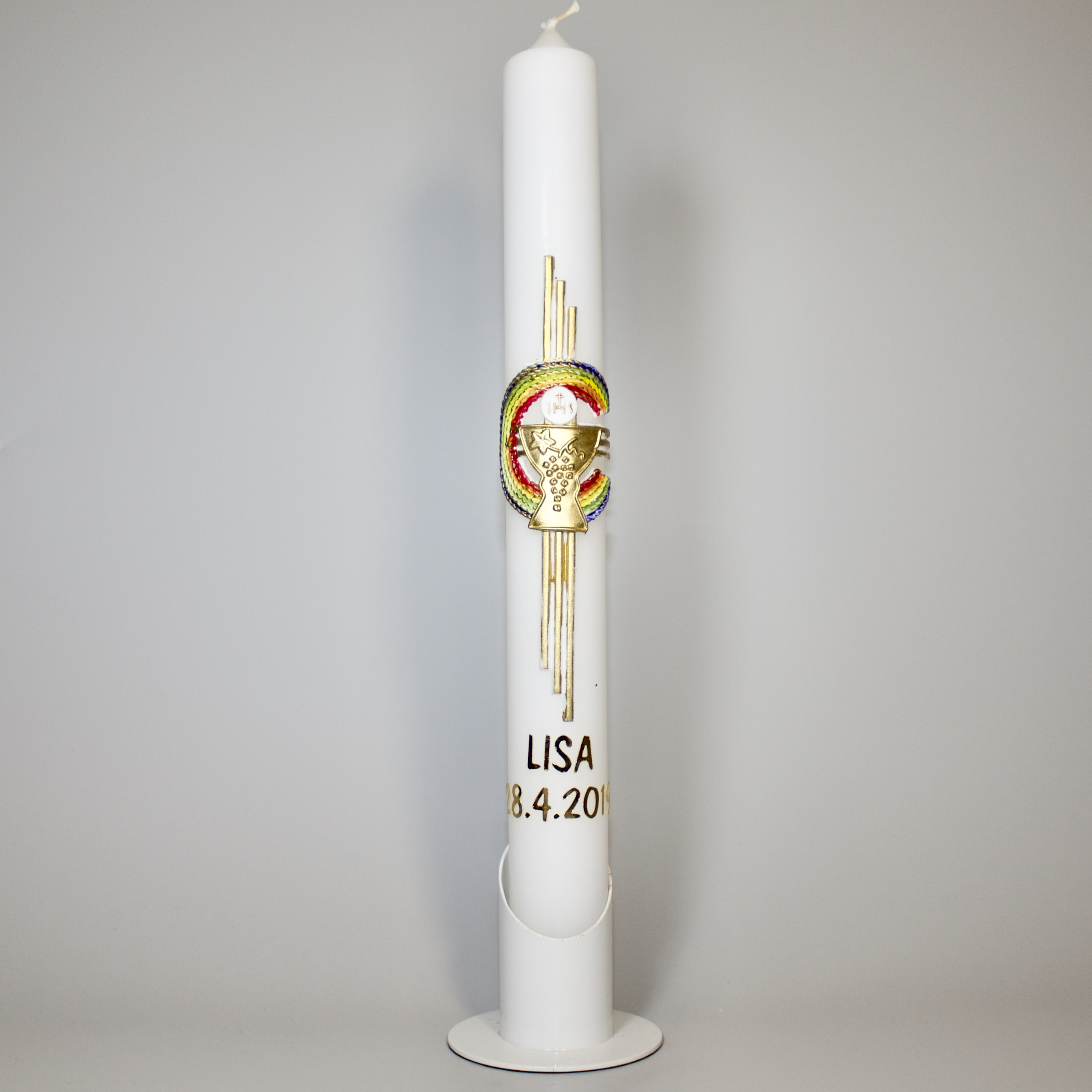 Eine Kommunionkerze (hergestellt in Deutschland) - inklusive einem hochwertigen Karton zur Aufbewahrung und zum Transport in die Kirche - kannst du kostenpflichtig zu dem Bastelset dazubestellen.