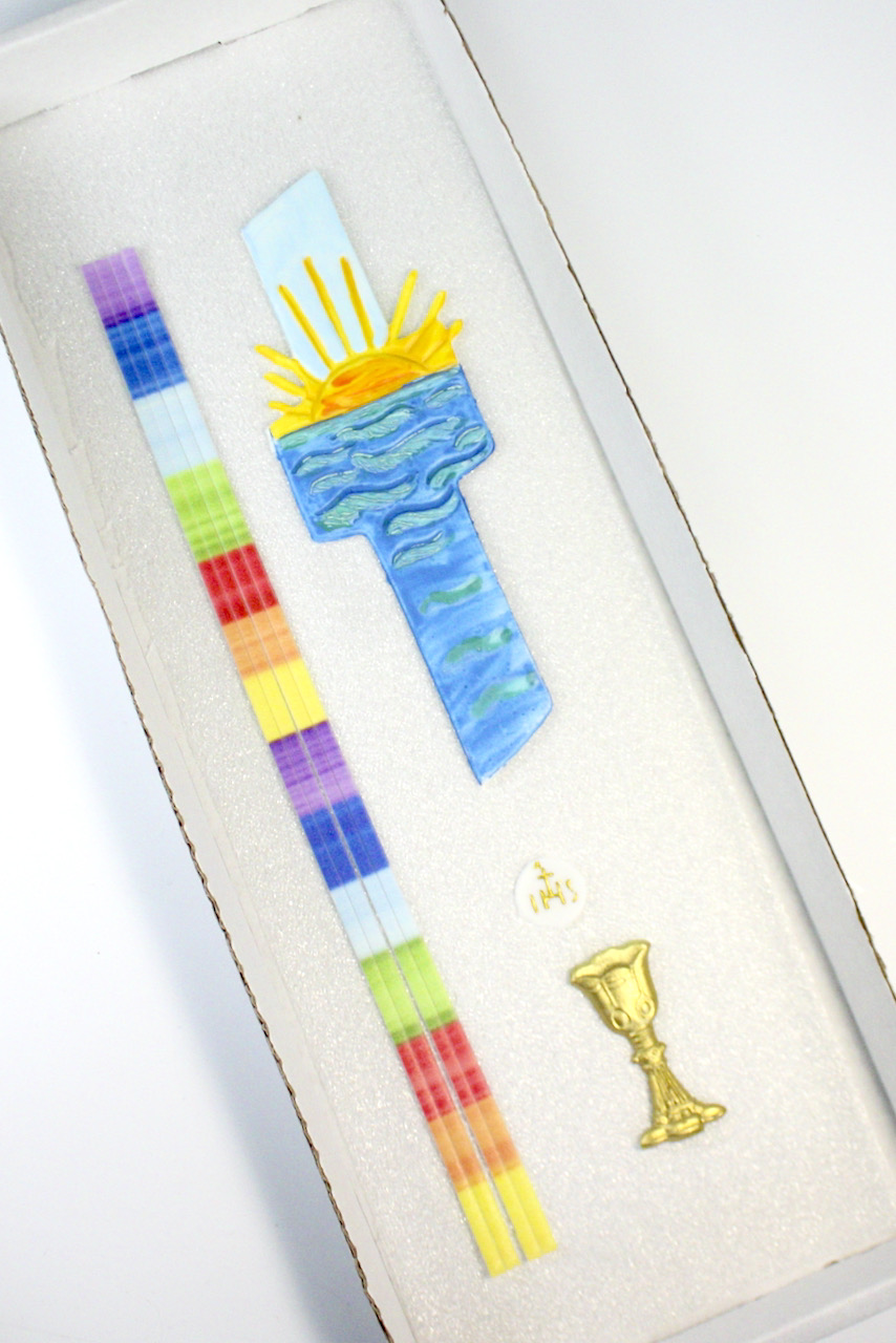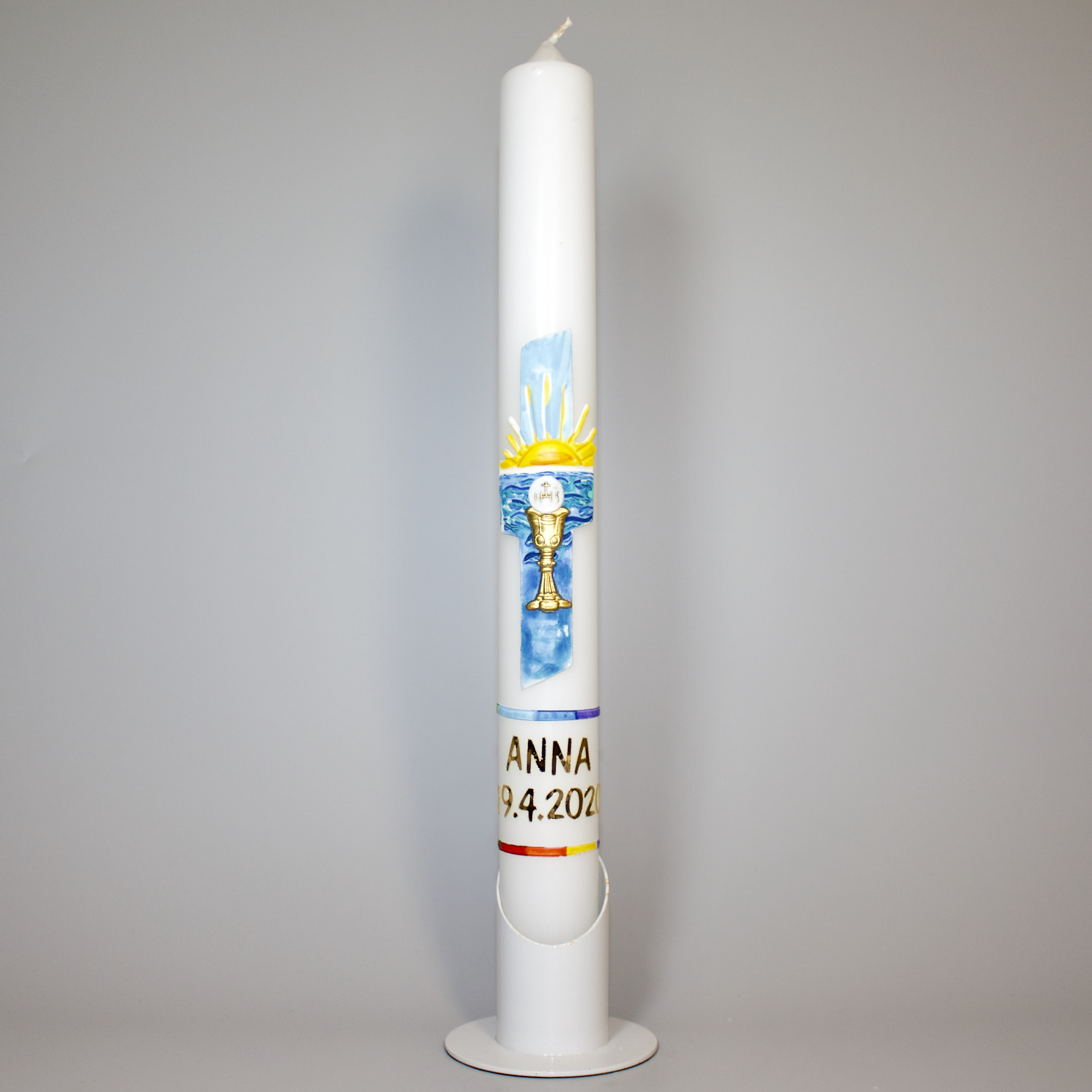 Eine Kommunionkerze (hergestellt in Deutschland) - inklusive einem hochwertigen Karton zur Aufbewahrung und zum Transport in die Kirche - kannst du kostenpflichtig zu dem Bastelset dazubestellen.