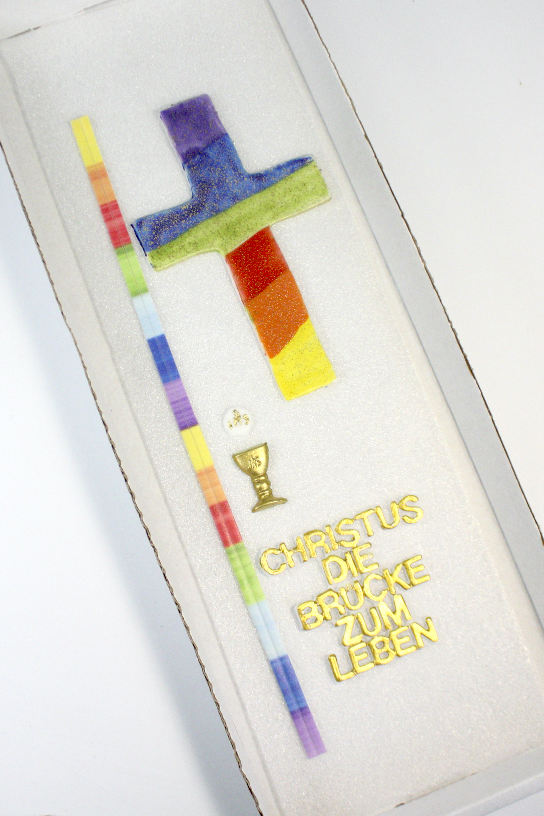 - buntes Kreuz in Regenbogenfarben und goldenen Tupfen