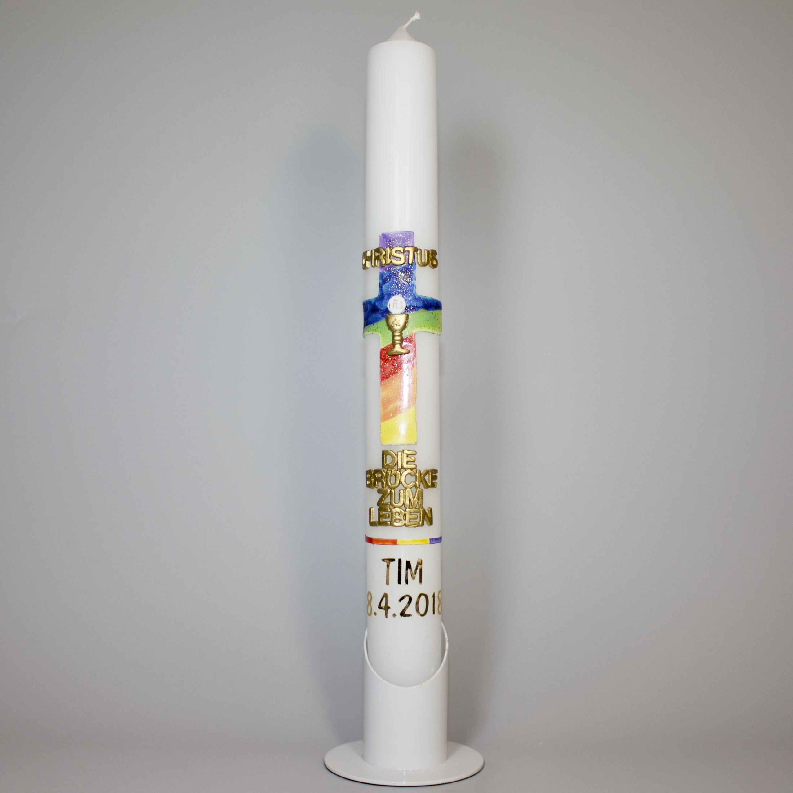 Eine Kommunionkerze (hergestellt in Deutschland) - inklusive einem hochwertigen Karton zur Aufbewahrung und zum Transport in die Kirche - kannst du kostenpflichtig zu dem Bastelset dazubestellen.