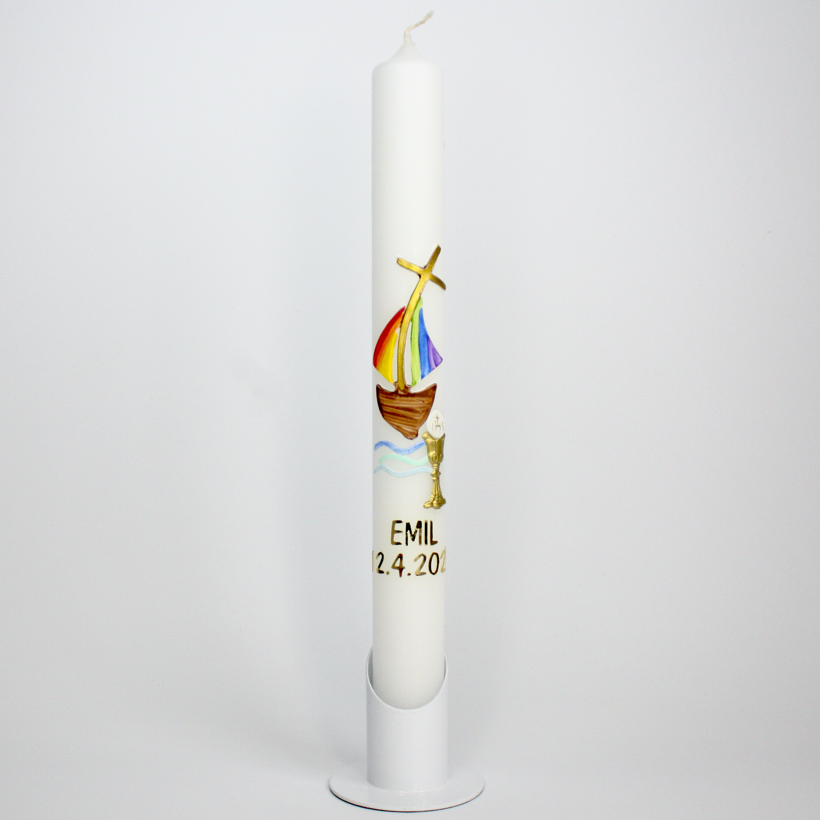 Eine Kommunionkerze (hergestellt in Deutschland) - inklusive einem hochwertigen Karton zur Aufbewahrung und zum Transport in die Kirche - kannst du kostenpflichtig zu dem Bastelset dazubestellen.