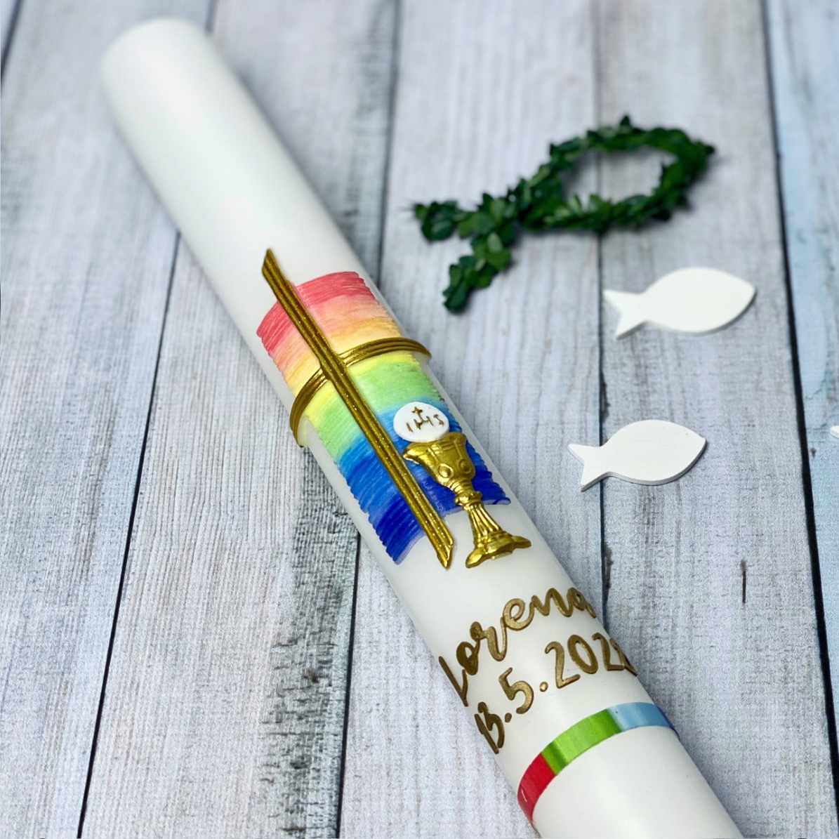 Eine Kommunionkerze (hergestellt in Deutschland) - inklusive einem hochwertigen Karton zur Aufbewahrung und zum Transport in die Kirche - kannst du kostenpflichtig zu dem Bastelset dazubestellen.