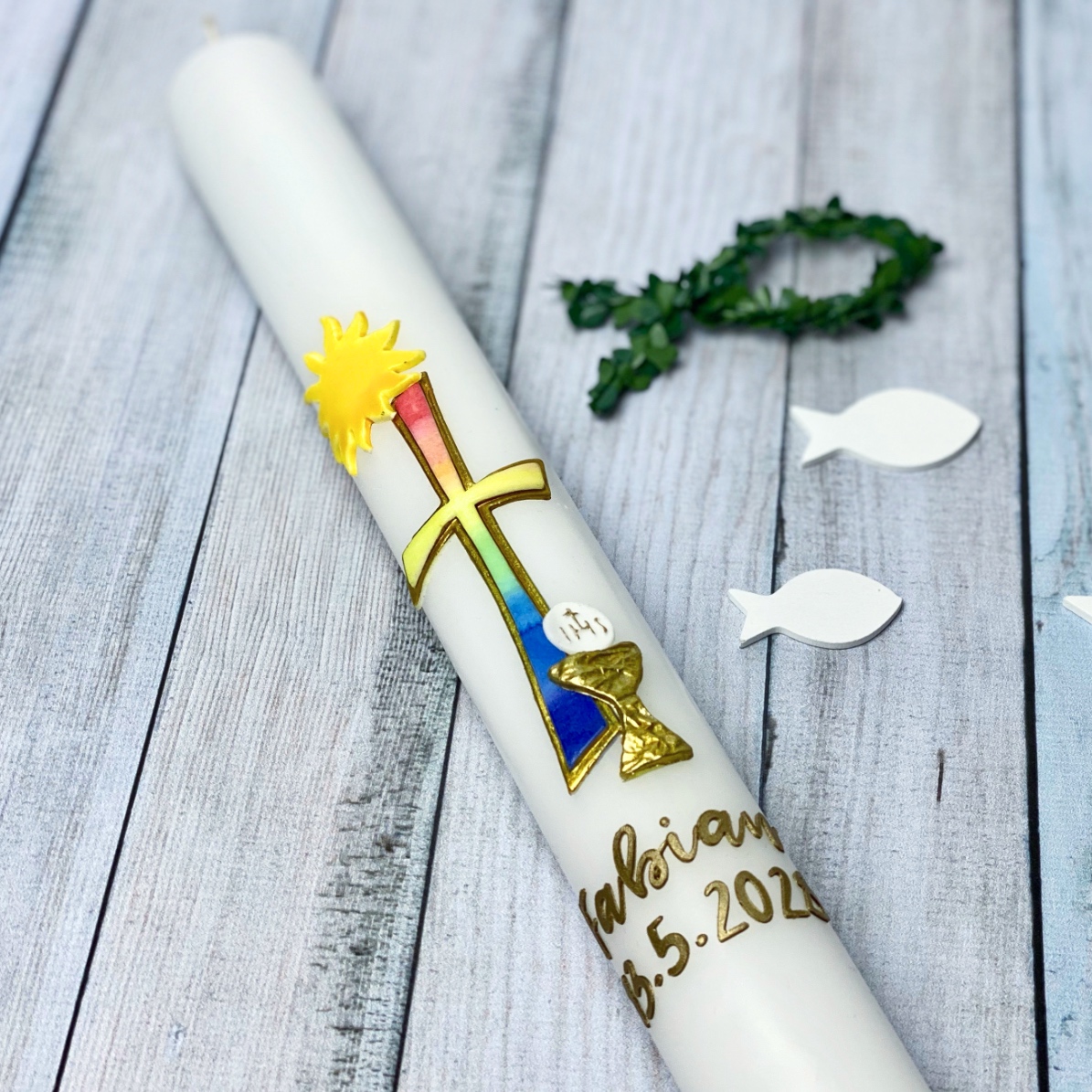 Eine Kommunionkerze (hergestellt in Deutschland) - inklusive einem hochwertigen Karton zur Aufbewahrung und zum Transport in die Kirche - kannst du kostenpflichtig zu dem Bastelset dazubestellen.