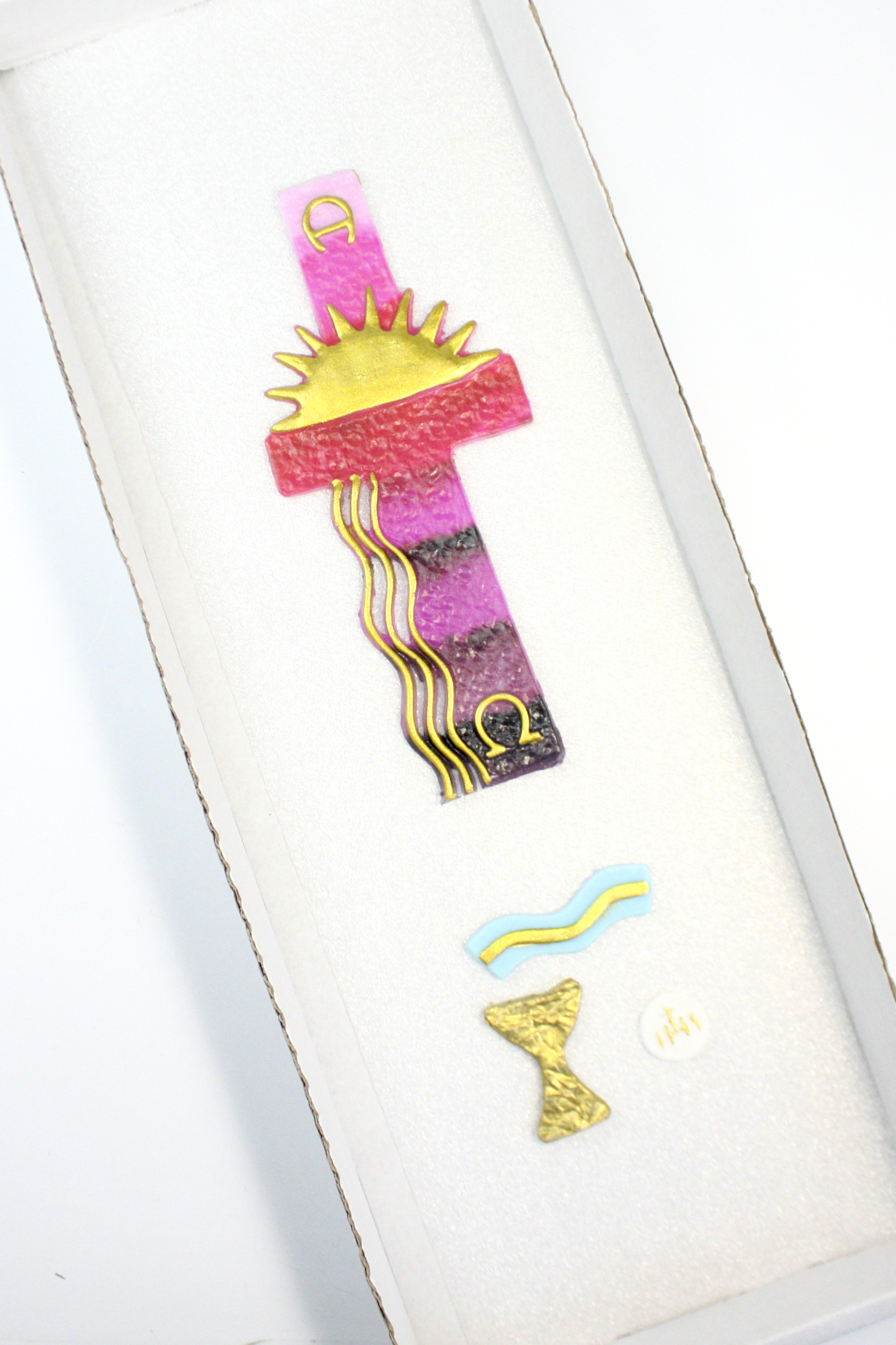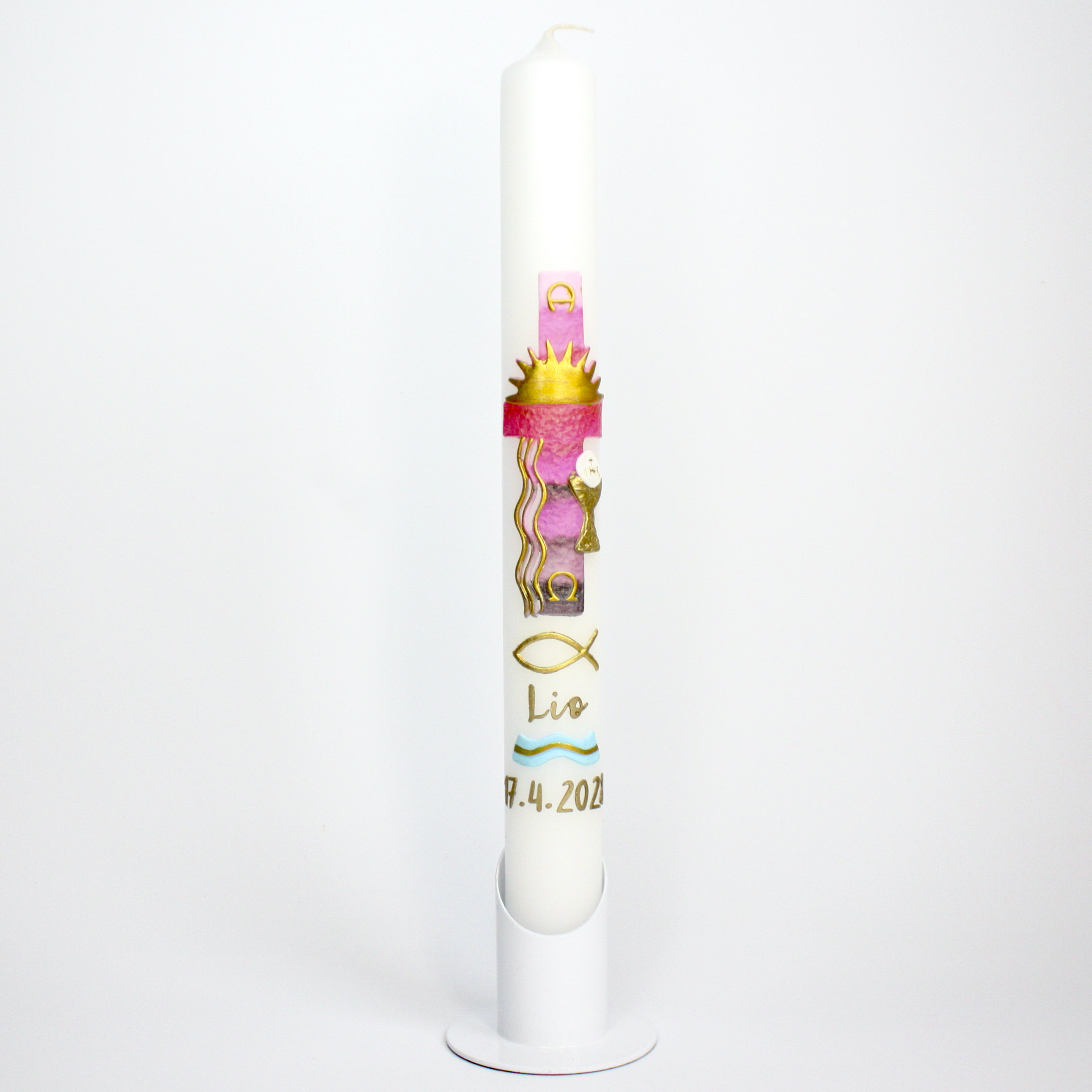Eine Kommunionkerze (hergestellt in Deutschland) - inklusive einem hochwertigen Karton zur Aufbewahrung und zum Transport in die Kirche - kannst du kostenpflichtig zu dem Bastelset dazubestellen.