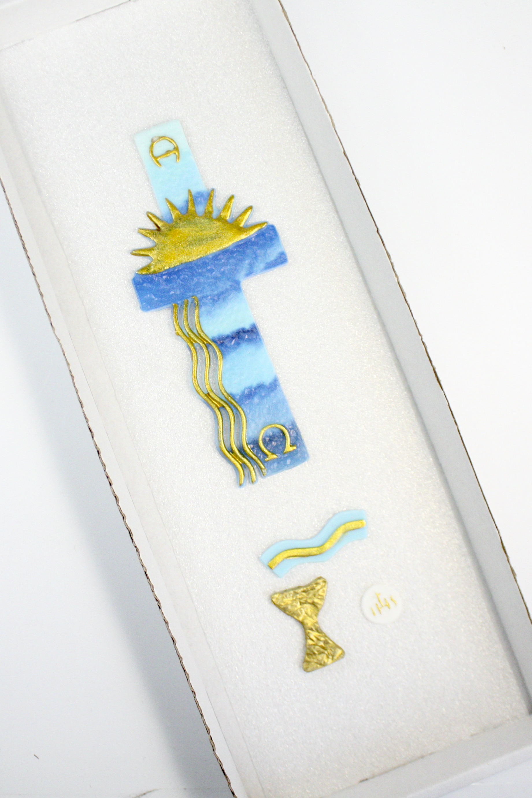 - blau-goldenes Kreuz mit Sonne und Alpha/Omega