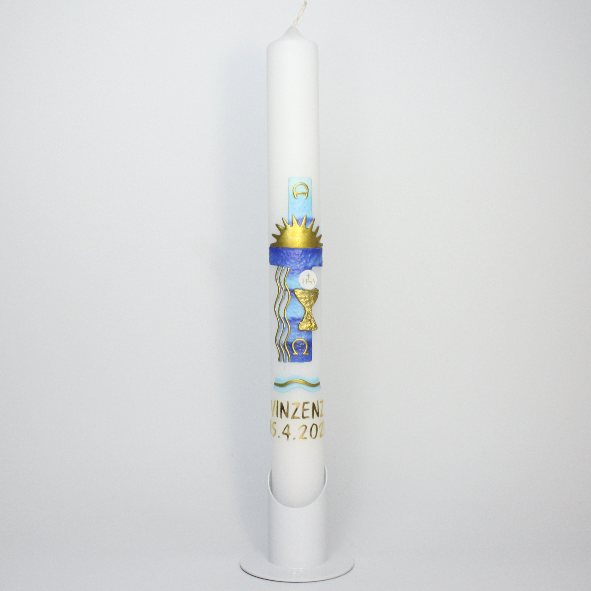 Eine Kommunionkerze (hergestellt in Deutschland) - inklusive einem hochwertigen Karton zur Aufbewahrung und zum Transport in die Kirche - kannst du kostenpflichtig zu dem Bastelset dazubestellen.