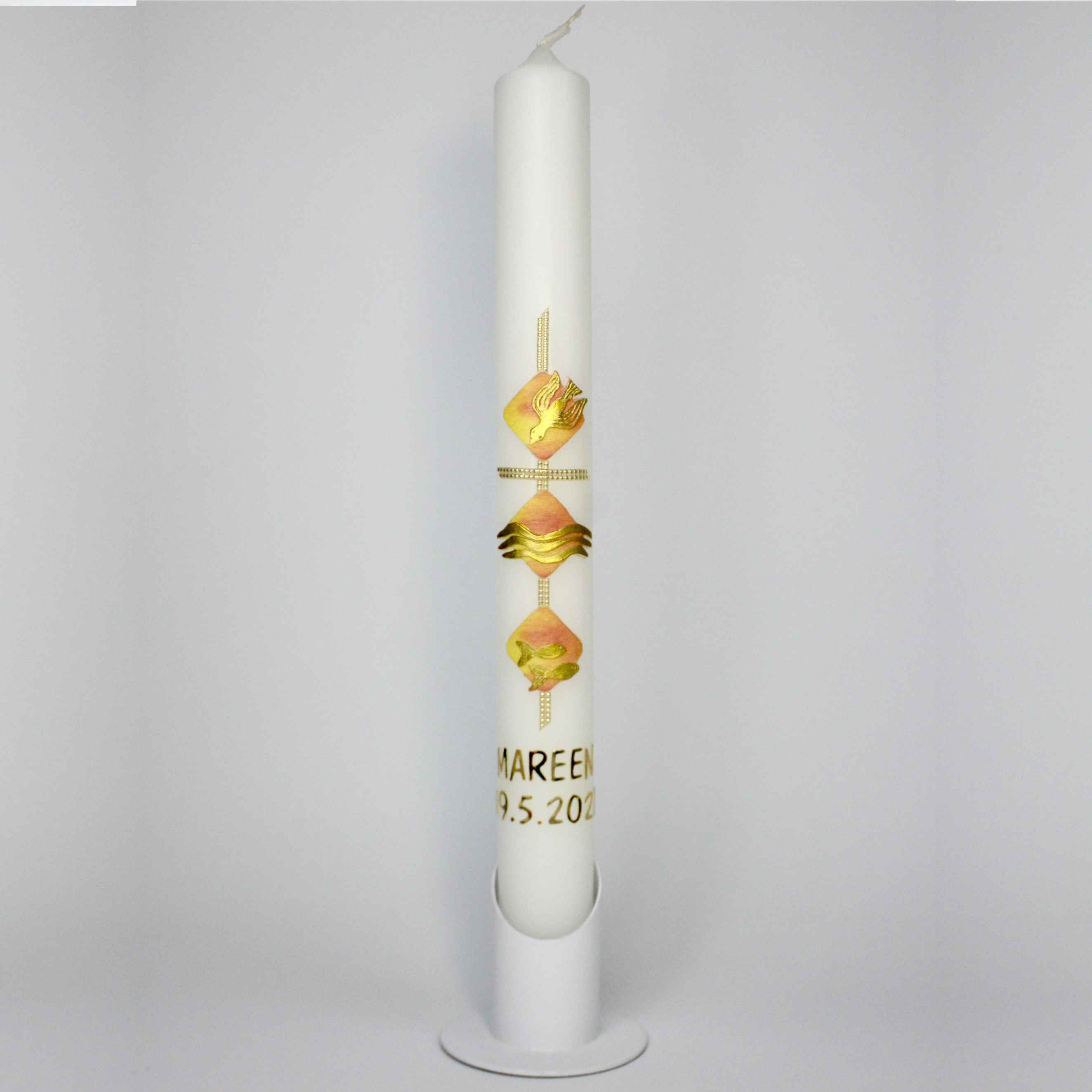 Eine Kommunionkerze (hergestellt in Deutschland) - inklusive einem hochwertigen Karton zur Aufbewahrung und zum Transport in die Kirche - kannst du kostenpflichtig zu dem Bastelset dazubestellen.