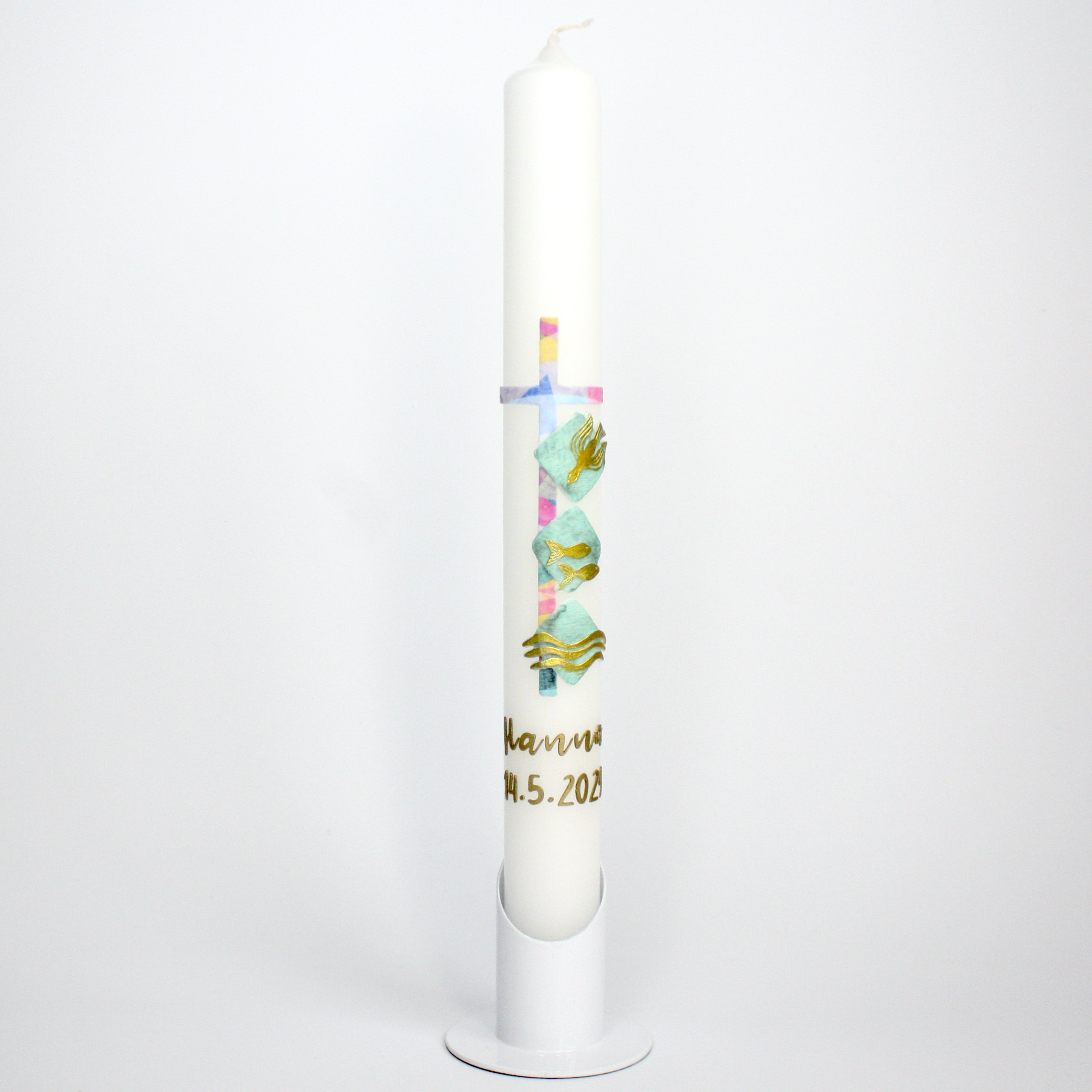 Eine Kommunionkerze (hergestellt in Deutschland) - inklusive einem hochwertigen Karton zur Aufbewahrung und zum Transport in die Kirche - kannst du kostenpflichtig zu dem Bastelset dazubestellen.