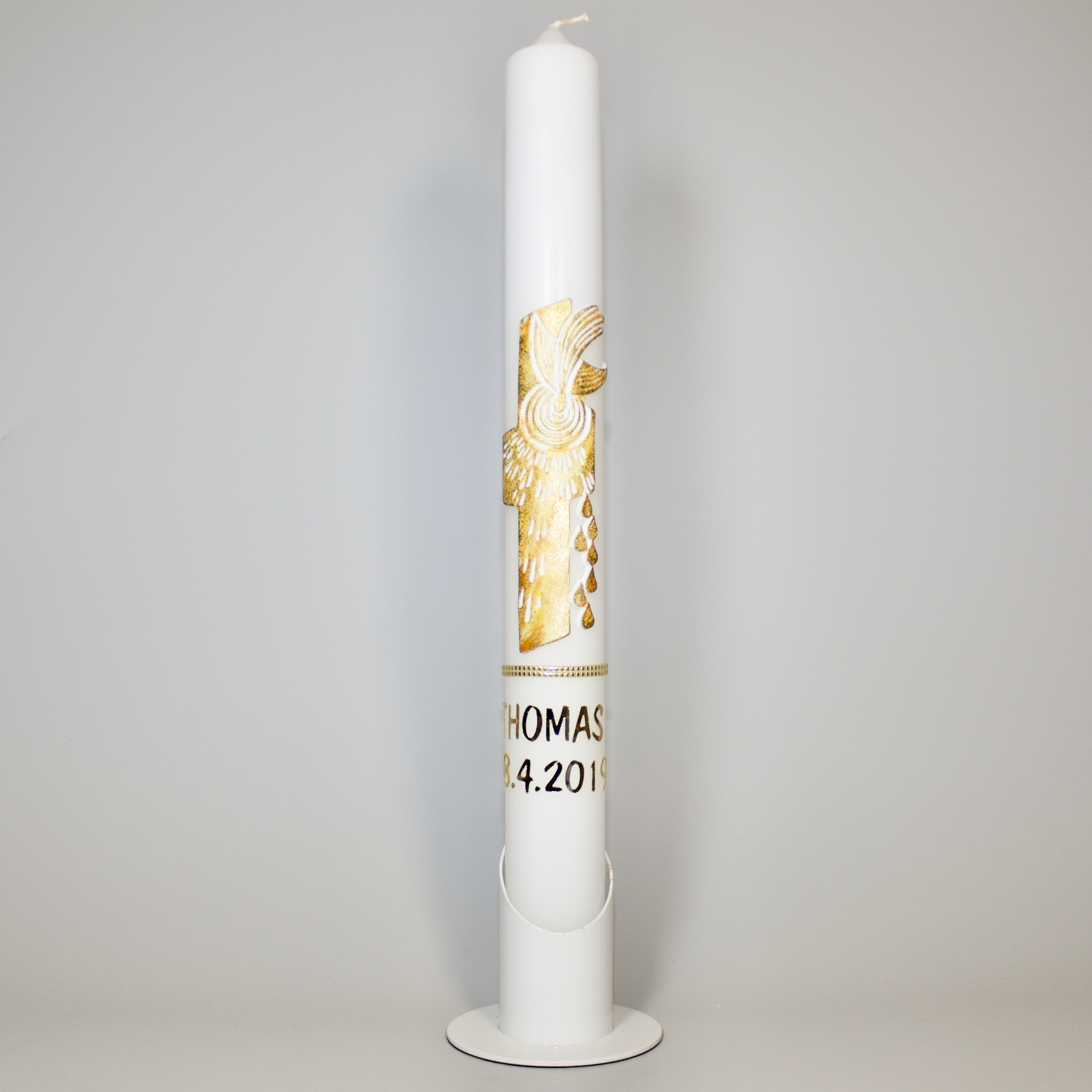 Eine Kommunionkerze (hergestellt in Deutschland) - inklusive einem hochwertigen Karton zur Aufbewahrung und zum Transport in die Kirche - kannst du kostenpflichtig zu dem Bastelset dazubestellen.